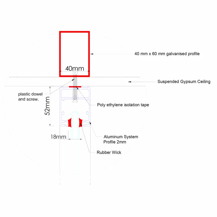 When acoustic glass is used and the partition wall is installed over a raised floor, a 10 cm wide stone wool-filled sound barrier should be placed under the floor, and a stone wool-filled sound barrier should also be installed in the ceiling directly above the partition walls.